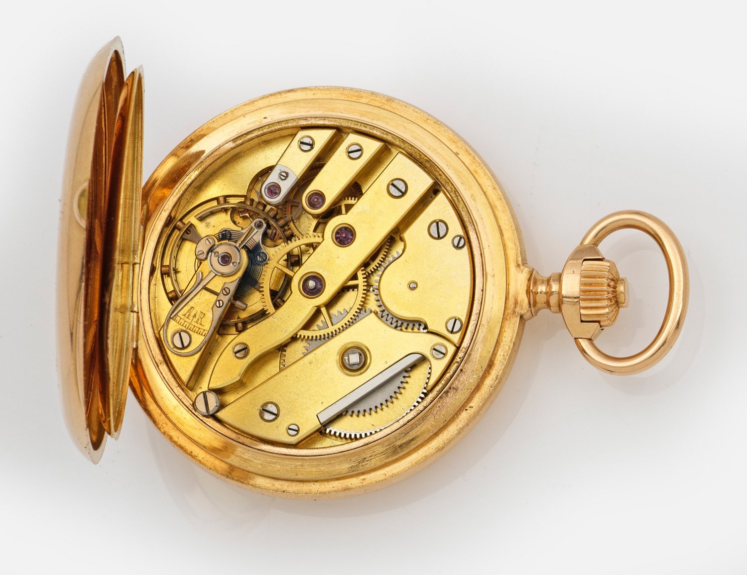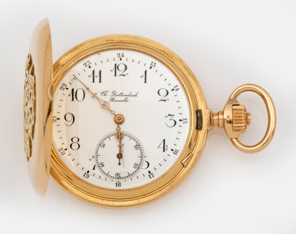 Schweiz und Belgien. Genf und Brüssel. Um 1900. Gelbgold, gest. 750 und mit Genfer Siegel. Savonettegehäuse mit schauseitigem, reliefiertem Ziermonogramm. Goldcuvette mit Herstellersignet C. Dégallier Fab(rican)t Geneve und Händlerzeichen Ch. Grottendieck Bruxelles. Weißes Emailzifferblatt mit arabischen Indexen, kleiner Sekunde, vergoldeten Zeigern und Händlerzeichen. Vergoldetes Brückenwerk mit Kronenaufzug, Unruhkolben mit Schwanenhals-Feinregulierung, Kompensationsunruh mit Breguet-Spirale und Ankerhemmung. Referenznr. 6365. D. 53,5 mm. Gew. ca. 126,38 g.