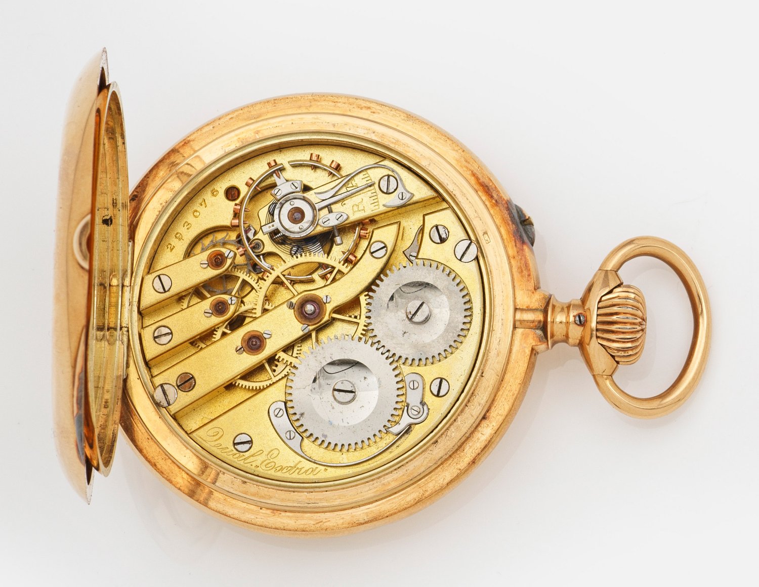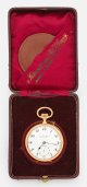 Schweiz. Um 1903. Gelbgold, gest. 14 k. Glattes Gehäuse mit breiter Lünette. Goldcuvette. Weißes Emailzifferblatt mit arabischen Indexen, kleiner Sekunde, gebläuten Birnzeiger und Herstellersignet. Vergoldetes Brückenwerk mit Kronenaufzug, Kompensationsunruh mit Breguetspirale und Ankerhemmung, Unruhkolben mit Feinregulierung. Platine bez. "Qual(ity). 'Extra'". Gehäusenr. 213160. Werknr. 293076. Originalschatulle. D. 53,5 mm. Gew. ca. 106,25 g.