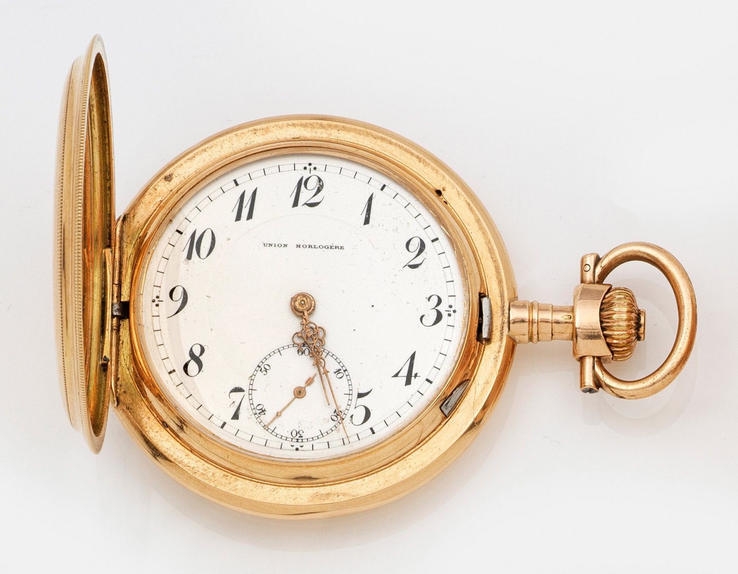 A hunting case pocket watch by Union Horlogère (Swiss watchmaker co-operative), Switzerland, circa 1910. Case in 14 k red gold. Dome in metal. Mechanical movement with crown wind.