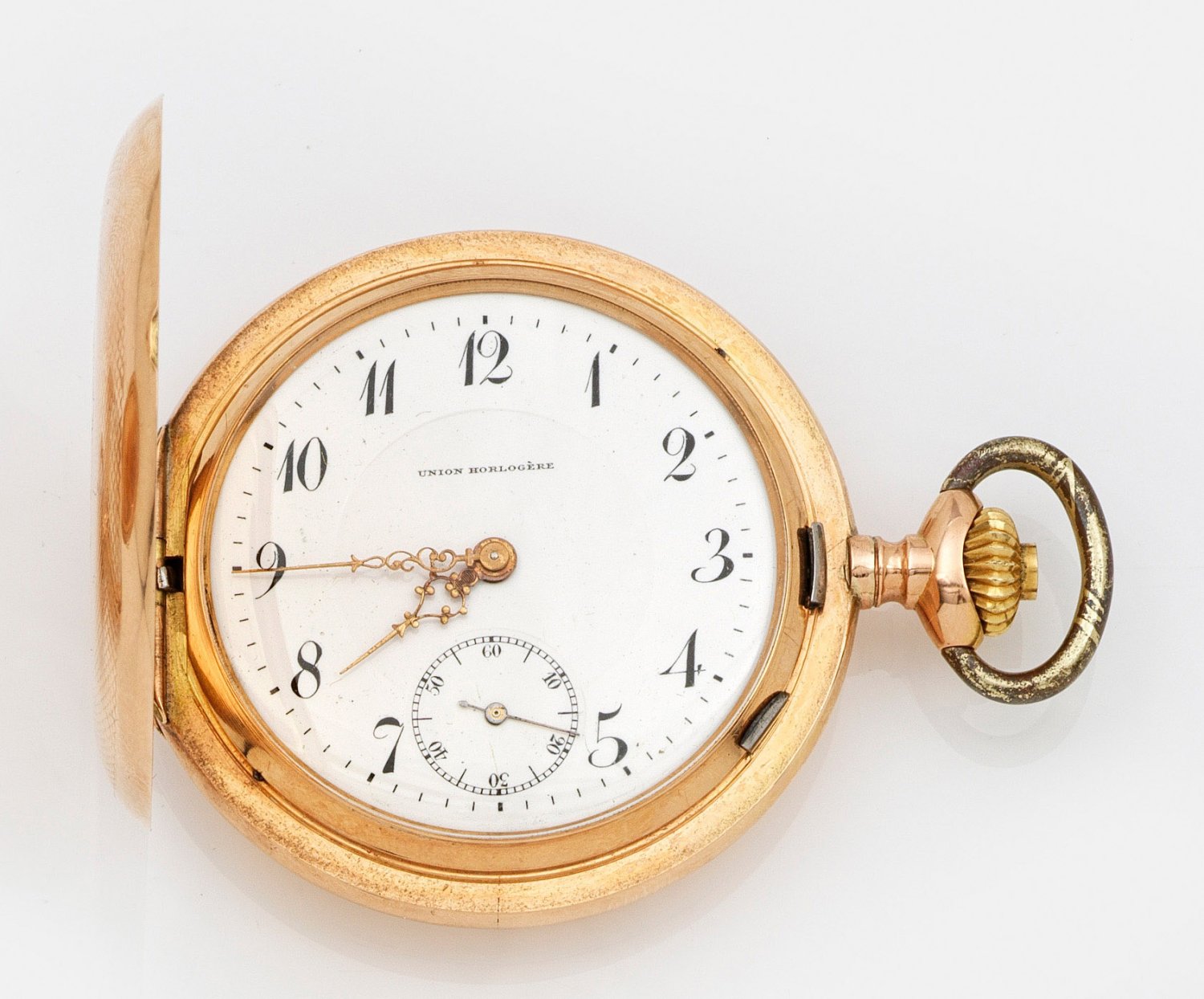 A hunting case pocket watch by Union Horlogère (Swiss watchmaker co-operative), Switzerland, circa 1920. Case in 14 k gold. Dome in metal. Mechanical movement with crown wind.