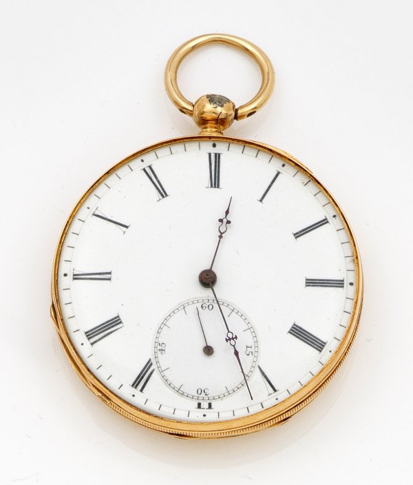 An openface pocket watch, circa 1890. Case in 18 k gold. Dome in metal. Mechanical movement with key wind.