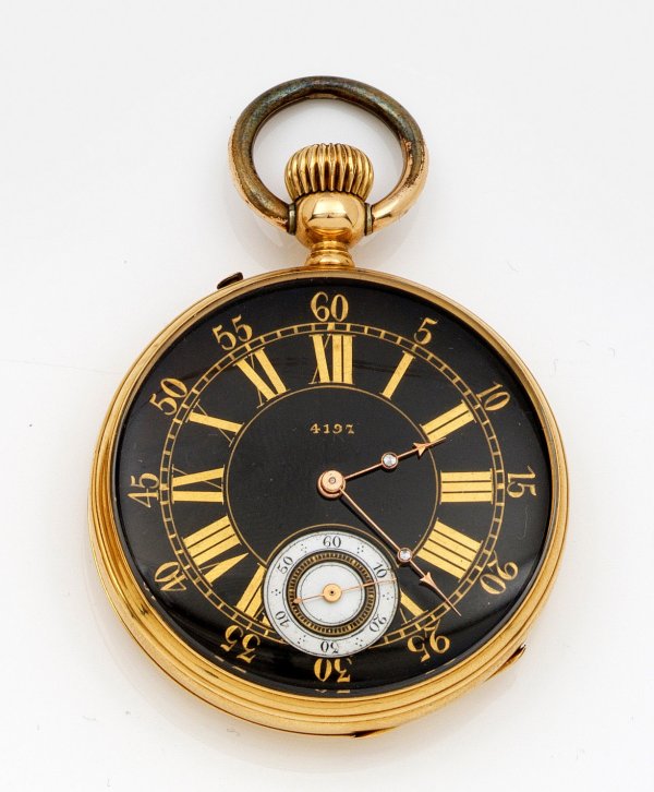 An Art Nouveau halfopen face pocket watch, circa 1890/1900. Case and dome in 18 k gold. Black enamelled dial. Mechanical movement with crown wind.