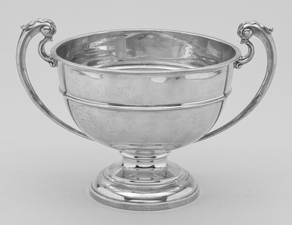 Sterlingsilber. Tief gemuldete Schale über mehrfach profiliertem, aufgewölbtem Stand. Korpus mittig mit umlaufend getrepptem Band verziert. Seitlich zwei durchbrochen gearbeitete, volutierte Handhaben mit Blattdekor. Gest., Beschaumarken, Herstellerzeichen, Jahresbuchstabe "k". Gew. ca. 695 g. H. 21 cm. 29,5 cm.