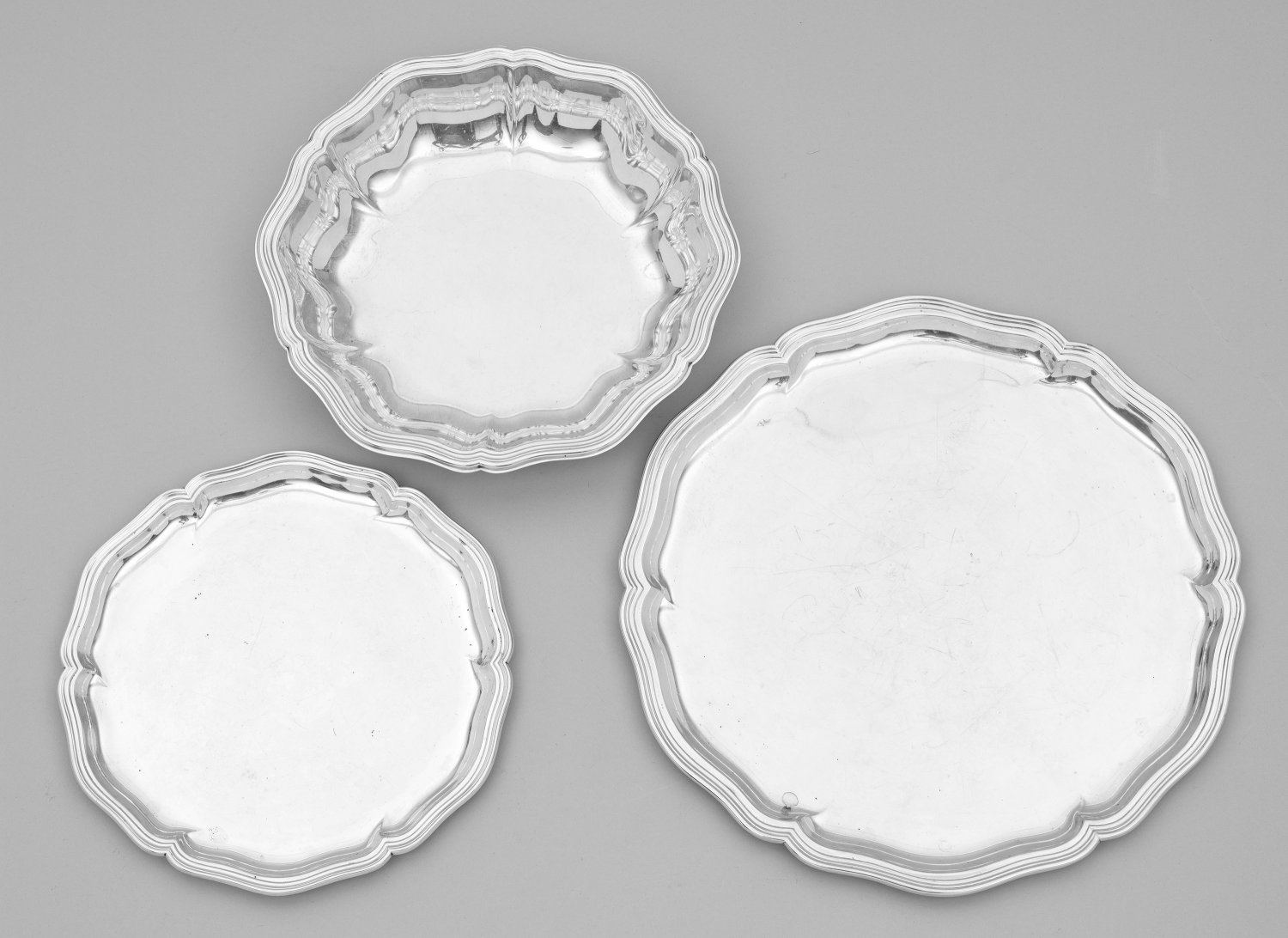 Silber. Runde Form. Flacher bzw. vertiefter, glatter Spiegel, übergehend in teilw. aufsteigende, durch vertikale Züge blütenförmig geschweifte Fahne mit gering ausgestelltem Rand. Modell-Nr. "9133", und "2718 (D. 24 bzw. D. 33)". Gest. 800, 830, Herstellerzeichen. Gew. 1250 g. D. 24 cm - 33 cm.