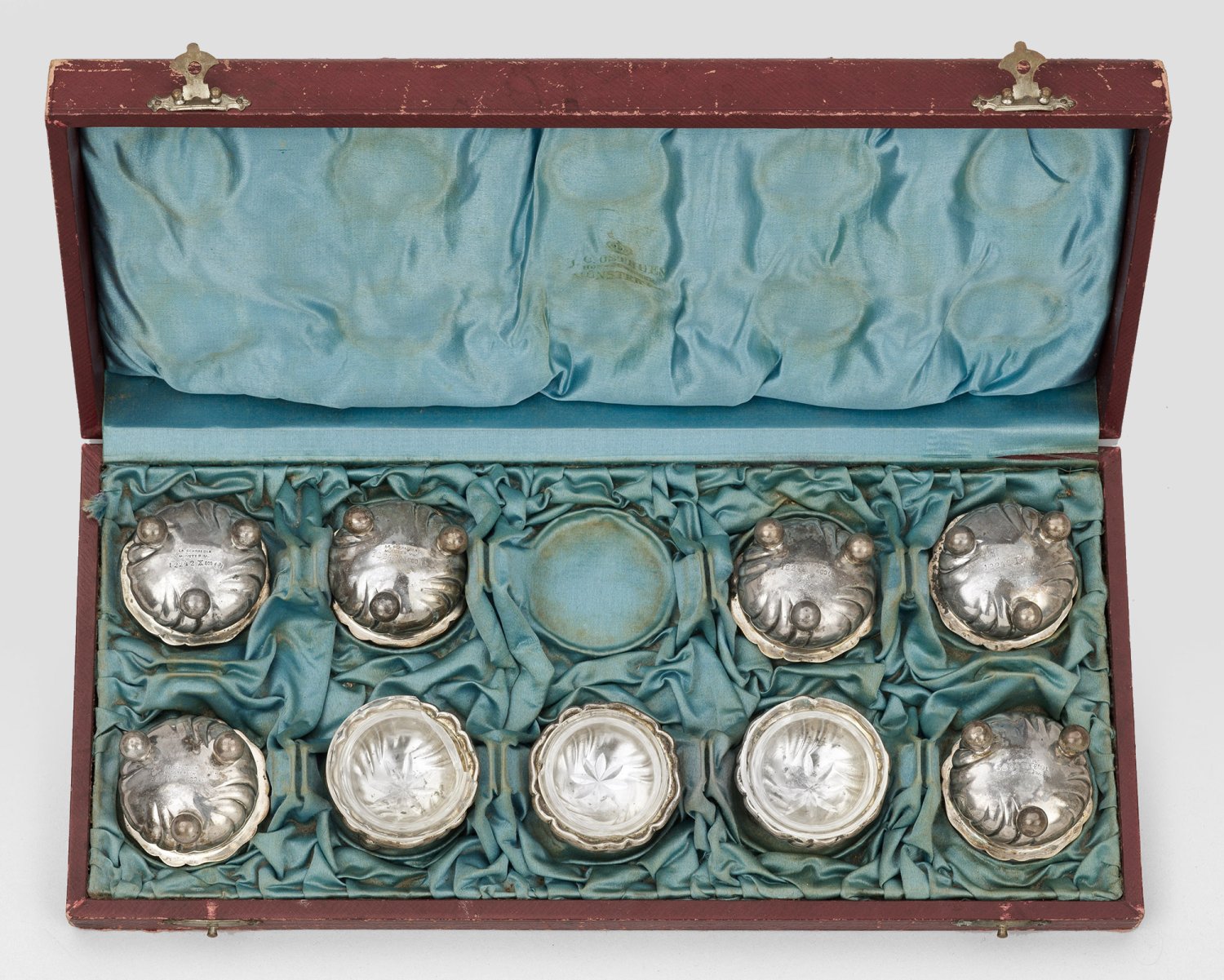 A set of nine German silver salieres with glass inset. Partly engraved coat of arm. Partly cracked. Gilt inside. Modell-no. 12242. With box. Standard mark 800, maker´s and dealer´s mark.