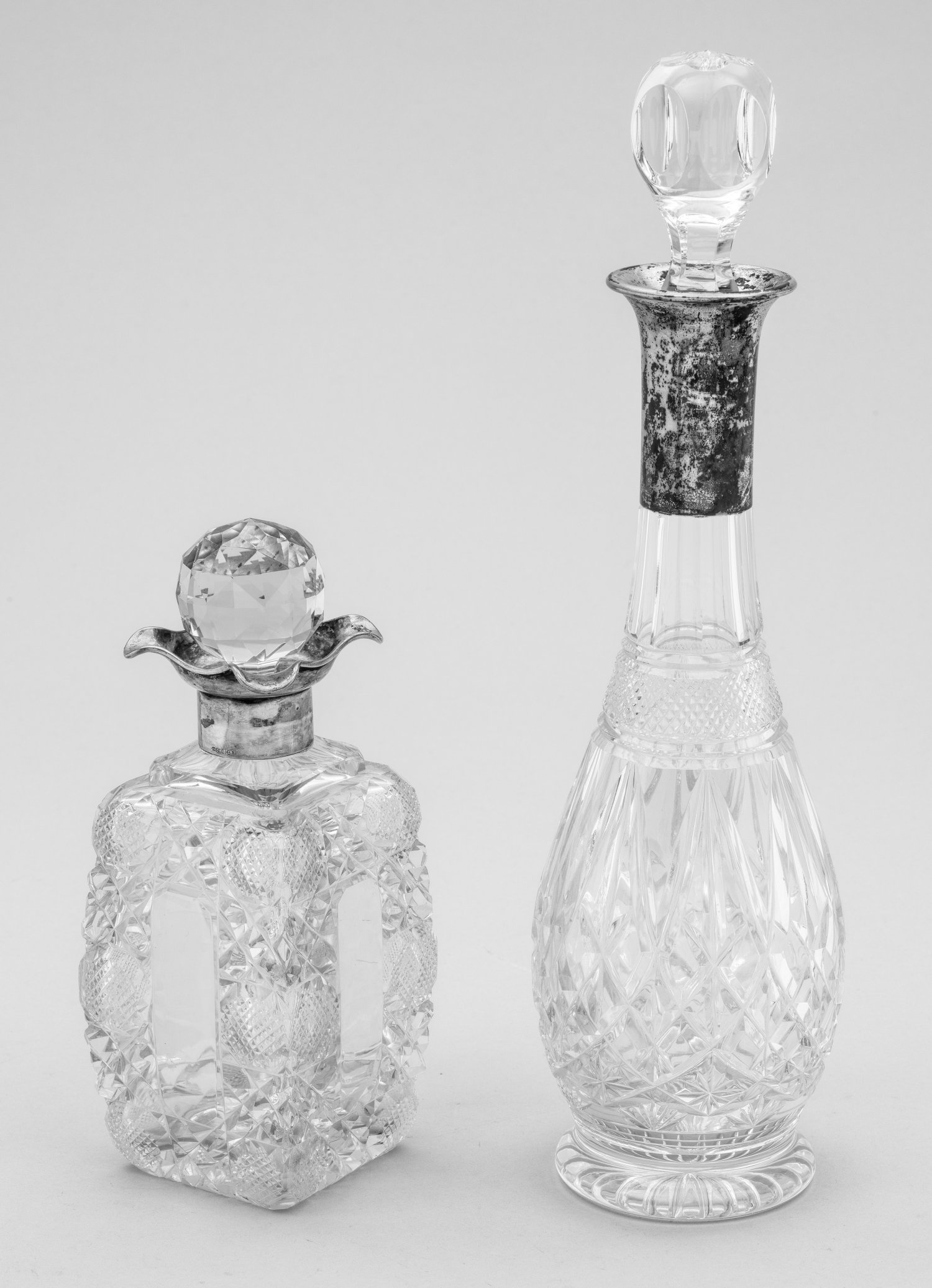 Rechteckiger bzw. tränenförmiger Korpus aus facettiertem Glas mit ausgestellter, teilw. blütenförmiger Silbermontierung am Hals und facettiertem Glasstöpsel. Minim. best.; Modell-Nr. "2828 39". Gest. 800, Herstellerzeichen. H. 23,5 cm - 39 cm.