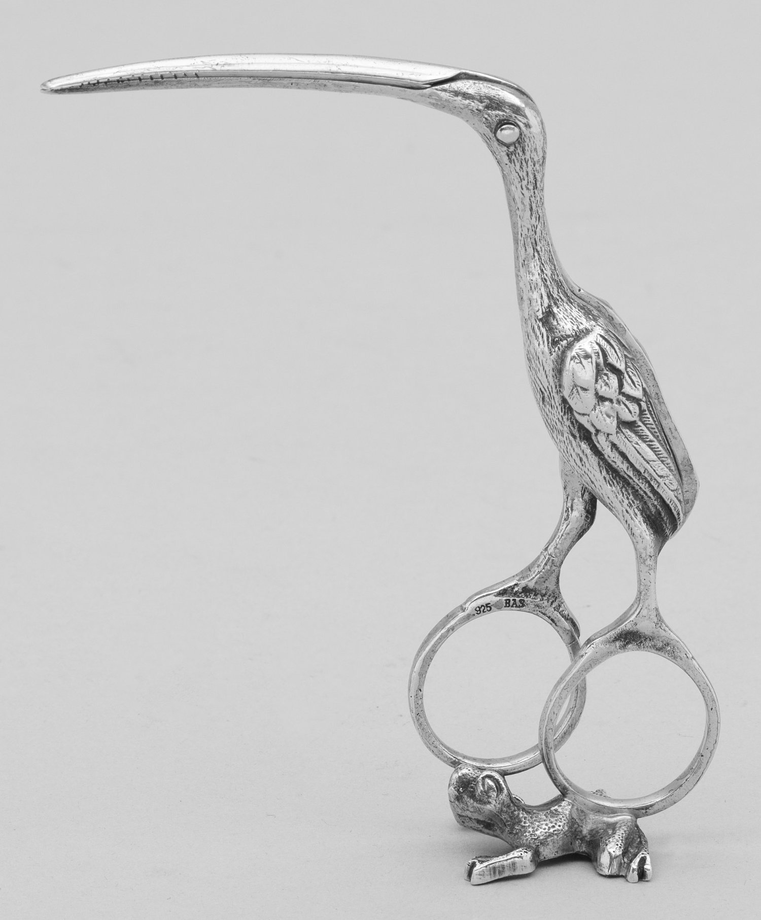 Sterlingsilber. Der Scherenkorpus in Form eines Storches, unterhalb ein Frosch als Stand. Die Scherenschenkel bilden den Schnabel des Storches. Gest. 925 Herstellerzeichen "BAS". Gew. ca. 55 g. L. 11,5 cm.