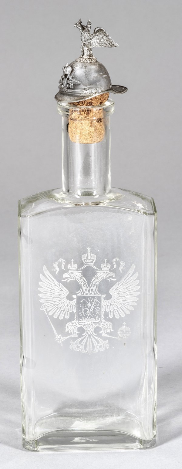 Glas und Silber. Rechteckige Flasche aus farblosem Glas mit abgeflachten Ecken. Schauseitig geätztes Wappen des russischen Kaiserreichs mit Doppelkopfadler und Darstellung des heiligen Georgs als Drachentöter. Obenauf ein kleiner Sturzbecher in Form eines Helmes, als Spitze ein vollplastischer Doppelkopfadler. Korken ergänzt. Gest. 84. Ges.-H. 30 cm.
