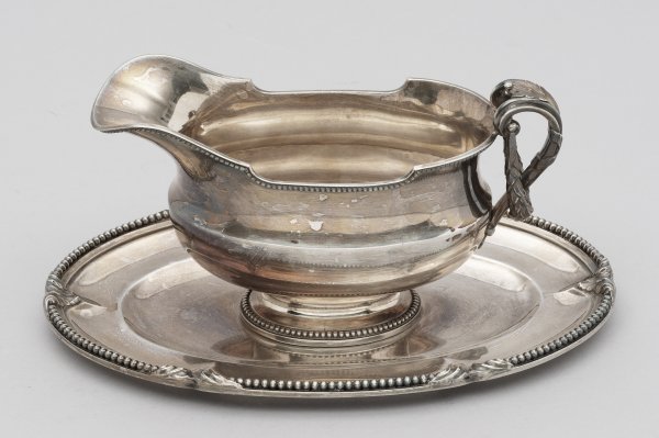 Silber. Über ovaler, montierter Unterschale schiffchenförmiger Korpus mit ausgezogenem Ausguss und zweigeteilter Handhabe, verziert mit Blattfeston, Akanthusblatt- und Kreuzbanddekor. Die Ränder umzogen von Perlfries und Blattwerk. Gest., französische Exportmarke nach 1878 für 950er Silber, Herstellerzeichen. Gew. ca. 680 g. H. 10,8 cm. 23,2 cm x 16,2 cm.