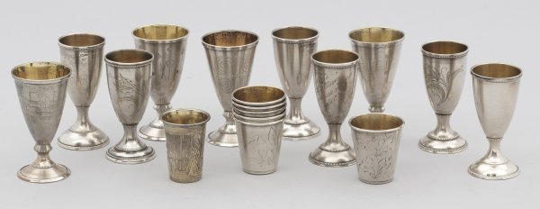 Silber. 17-tlg.; 7 flache und 10 gefußte Becher, runde Grundform mit leicht konischer Kuppa, teilw. gravierte und monogr. Wandung. Innen vergoldet. Gest. 875 bzw. 916. Gew. zus. ca. 425 g. H. 4 cm - 7,5 cm.