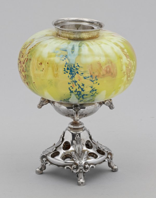 Silber und Glas. Über vier stilisierten Pferdehufen durchbrochen gearbeiteter Sockel, verziert mit Akanthusblättern. Kurzer Schaft akzentuiert durch vier ausgestellte, vollplastische Pferdeköpfe als Träger für gedrückt-kugeligen Korpus aus opalisierendem, gelbgrünem Glas mit weißen, roten und blauen Einschmelzungen. Geringfügiger nicht durchgehender Spannungsriss im Glaskorpus. H. 21 cm.