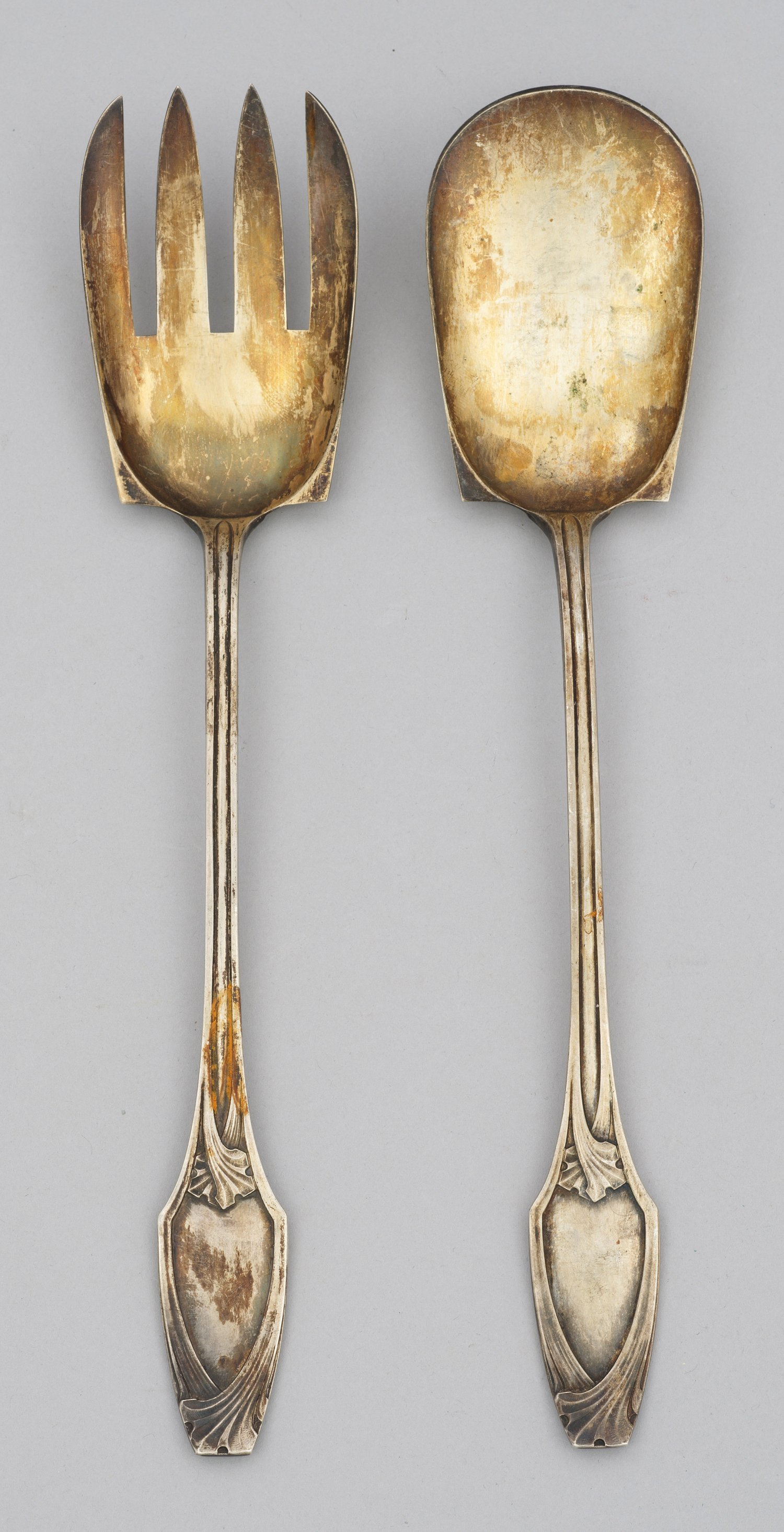 A German Art Nouveau parcel-gilt silver salad cutlery. Standard mark 800, maker´s mark.