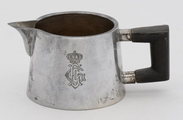 Silber. Konischer, glatter Korpus mit spitzer Tülle und gekantetem Holzhenkel. Schauseitig monogr. "EG" unter Herzogskrone. Innen vergoldet. Gest., Beschauzeichen, Herstellerzeichen "J.C.K." sowie Doppeladler für Hoflieferanten. Gew. ca. 90 g. H. 4,8 cm.