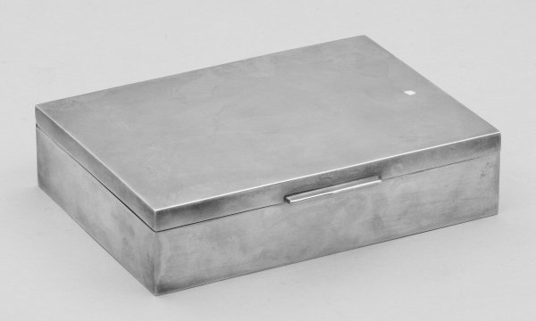 Silber, Holz. Rechteckiger, glatter Korpus. Schauseitiger, schmaler Drücker. Im Inneren Korpus aus Holz. Gest. 800, Beschauzeichen, Meisterzeichen "FB" sowie eine französische Lilie. Gew. ca. 315 g. H. 3,3 cm. 14 cm x 10,5 cm.
