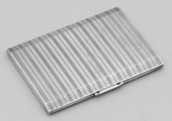 Silber. Rechteckige Form flächendeckend mit Lineardekor verziert. Innen mit klappbarem, guillochiertem Bügel. Schließe besch.; Gest. 900, Beschauzeichen, Herstellerzeichen "AP". Gew. ca. 170 g. H. 0,7 cm. 11,8 cm x 8,5 cm.