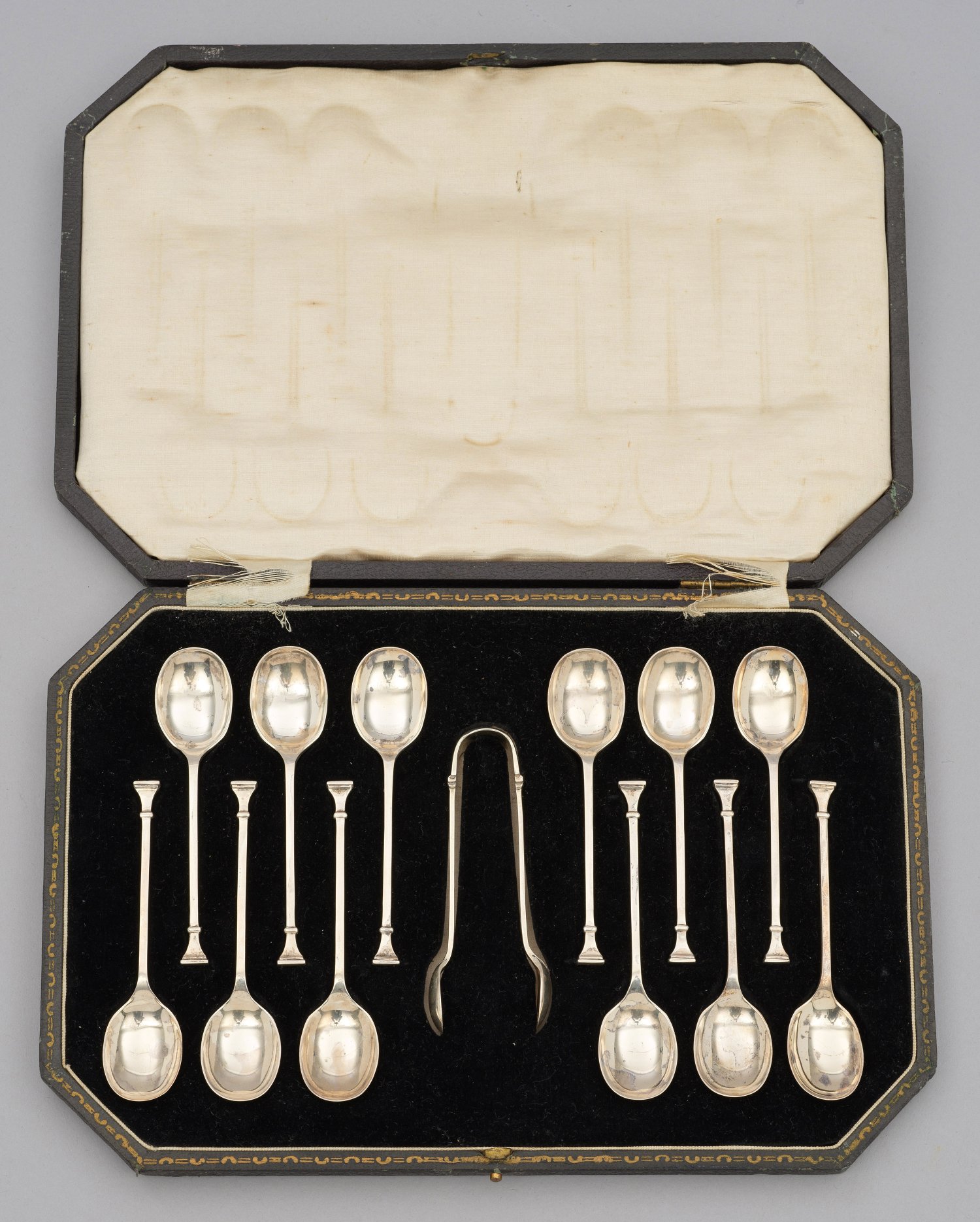 in originalem Bestecketui. Sterlingsilber. 13-tlg.; Gerundete, leicht vertiefte Laffe, übergehend in gerades, am Ende ausschwingendes, kantiges Heft. Gest., Beschauzeichen, Herstellerzeichen, Jahresbuchstabe "e" und "f". Gew. zus. ca. 150 g. L. 9,5 cm - 10,5 cm.