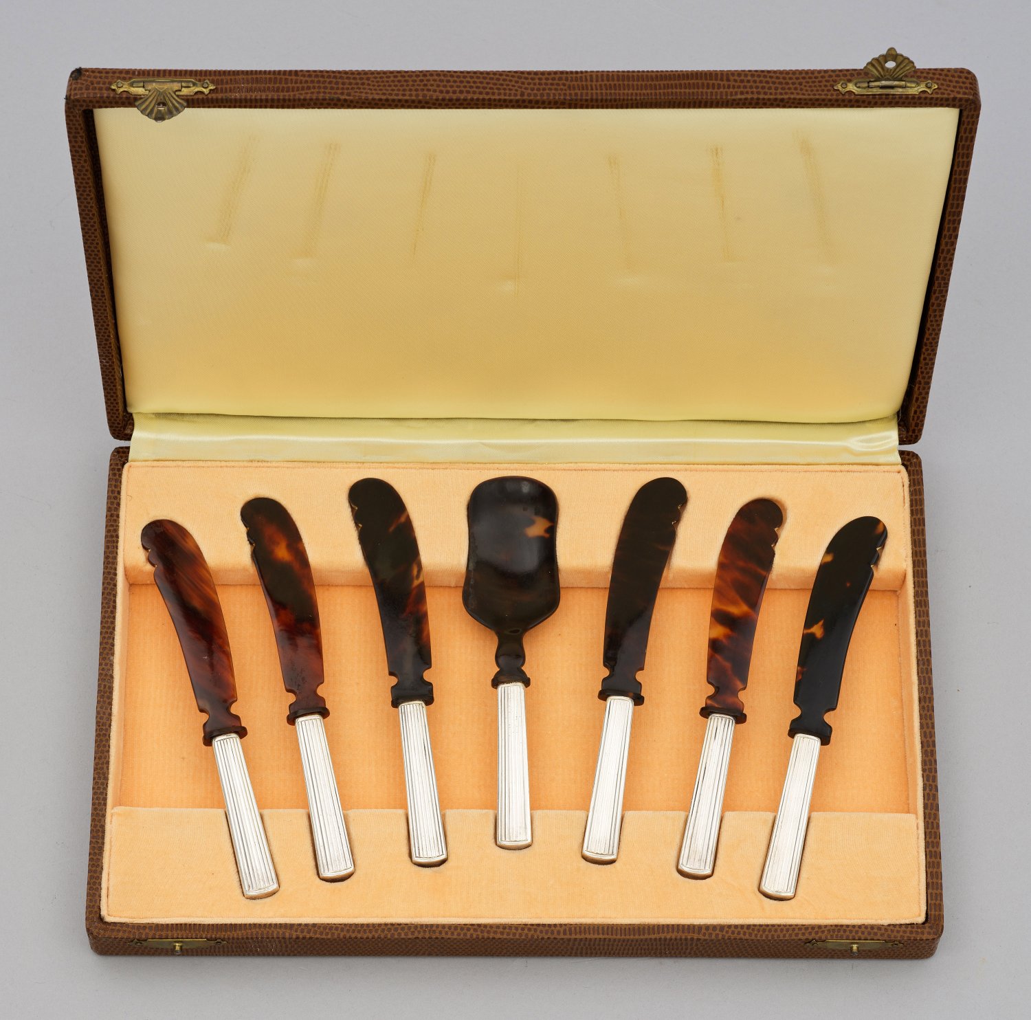 in originalem Etui. Sterlingsilber und Horn. Gering konischer, gekanteter und kannelierter Griff mit glatten Kanten. Heft und Laffe aus Horn. Gest. 925, Herstellerzeichen. L. 14 cm - 14,5 cm.