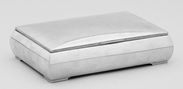 Silber. Rechteckiger Korpus über vier schmalen Füßen. Glatte, gering nach außen gewölbte Wandung und korrespondierender Scharnierdeckel. Füße und Deckelrand umlaufend mit schmalen Kanneluren verziert. Innen mit Holz ausgekleidet. Gest., Beschauzeichen mit Dat., Beschaumeister Johannes Siggaard (1932-1960). Ges.-Gew. 915 g. H. 6 cm. 23,5 cm x 15,5 cm.