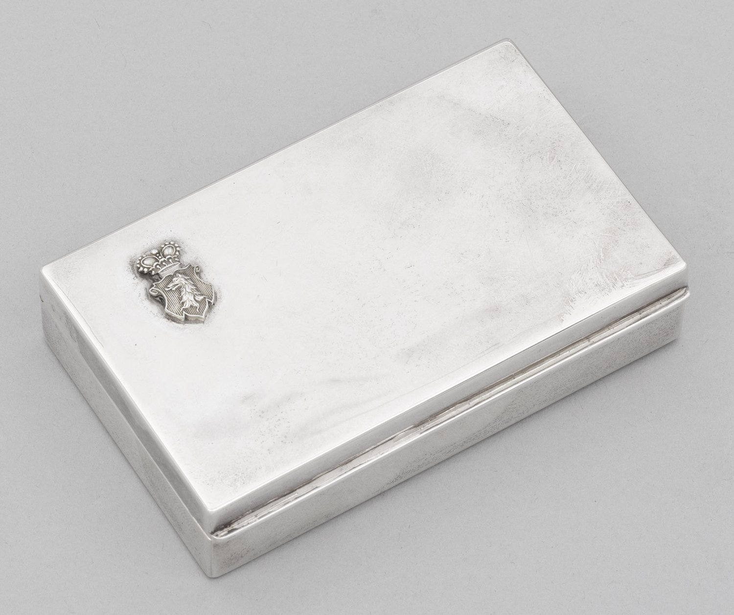 Sterlingsilber. Rechteckig, mit glatter Wandung und flachem, scharniertem Deckel. Schauseitig appliziertes kleines Wappenschild wohl mit dem Wappen des österreichischen Adelsgeschlechts von Windisch-Graetz unter Fürstenhut. Gest. 925, Beschauzeichen. Gew. ca. 130 g. H. 2,5 cm. 9,5 cm x 6 cm.