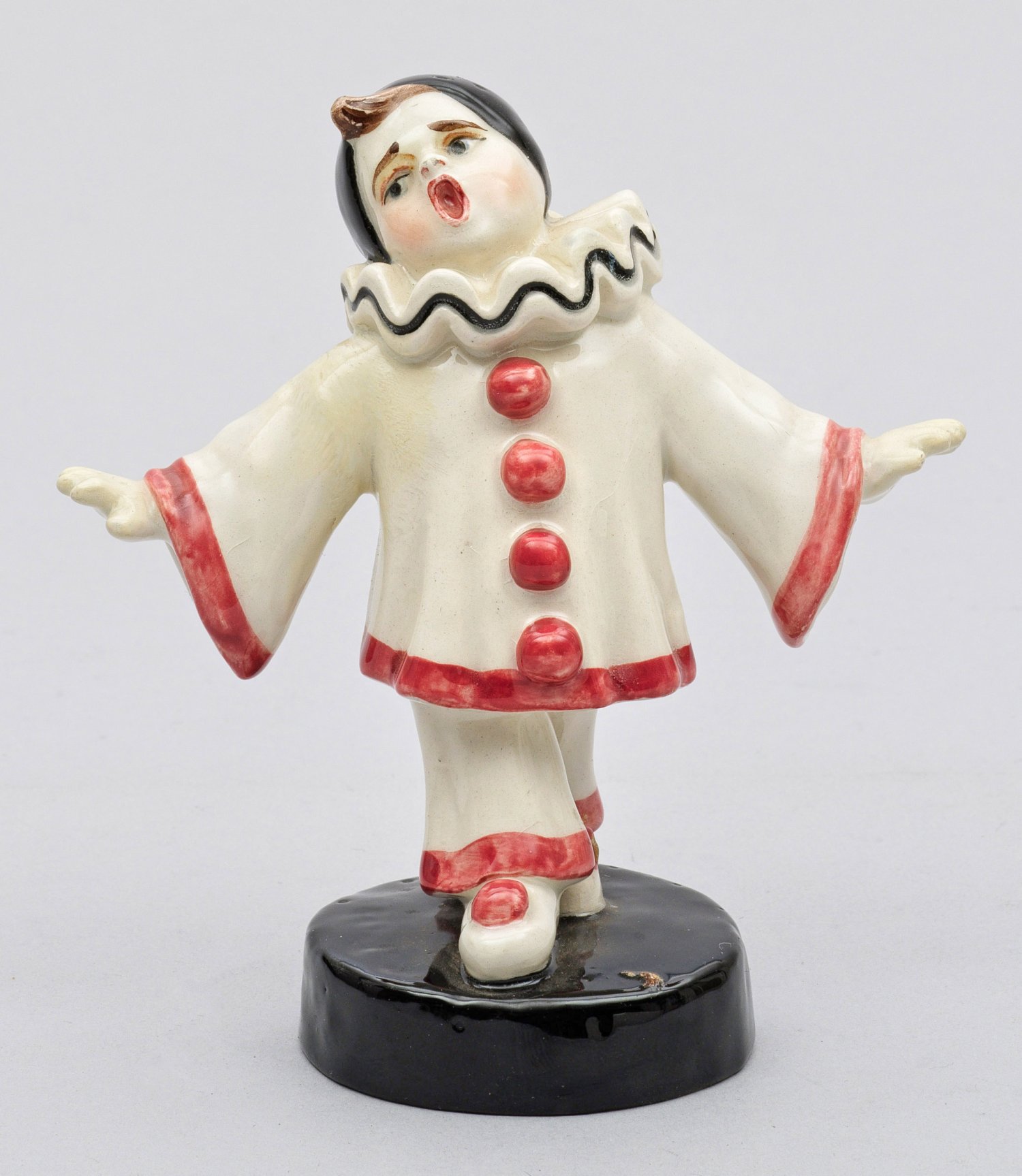 Steingut, gegossen. Auf runder Plinthe stehender Pierrot mit ausgebreiteten Armen. Schwarze und himbeerrote Bemalung. Ger. rest.; Modell-Nr. 1853, Firmenmarke u. Bez. "AUSTRIA". H. 11,8 cm.