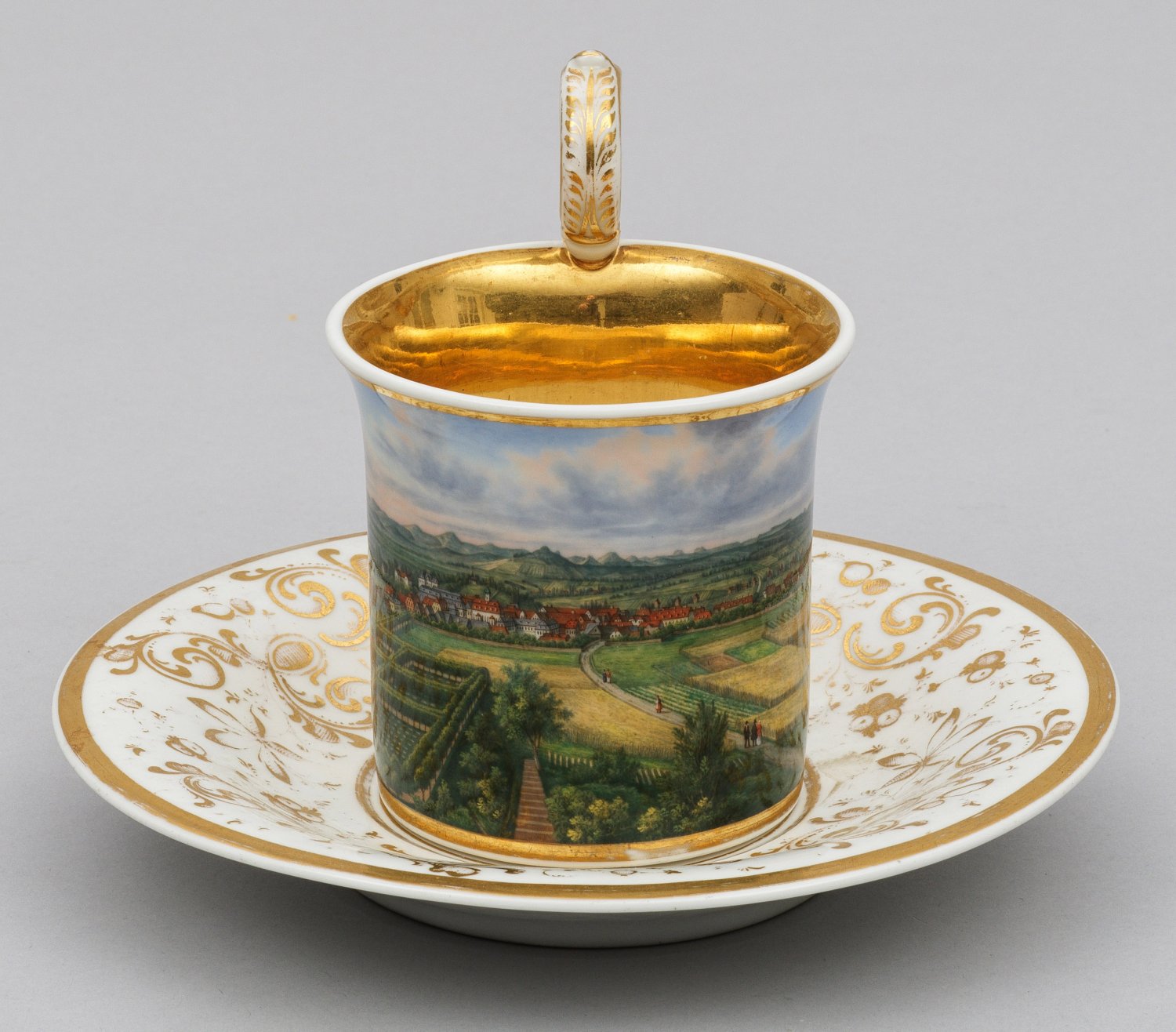 auf Untertasse. Zylinderförmig ausschwingender Korpus mit seitlich hochgezogenem Volutenhenkel. In schauseitig goldgerahmter Rechtecksreserve weitläufige Ansicht von Herrnhuth in Sachsen mit Landschaftsgärten, Häuserkulissen und Bergpanorama. Feine polychrome Malerei mit Goldstaffage. Minim. ber.; Zepter- und Adlermarke. Tassen-H. 11,5 cm.