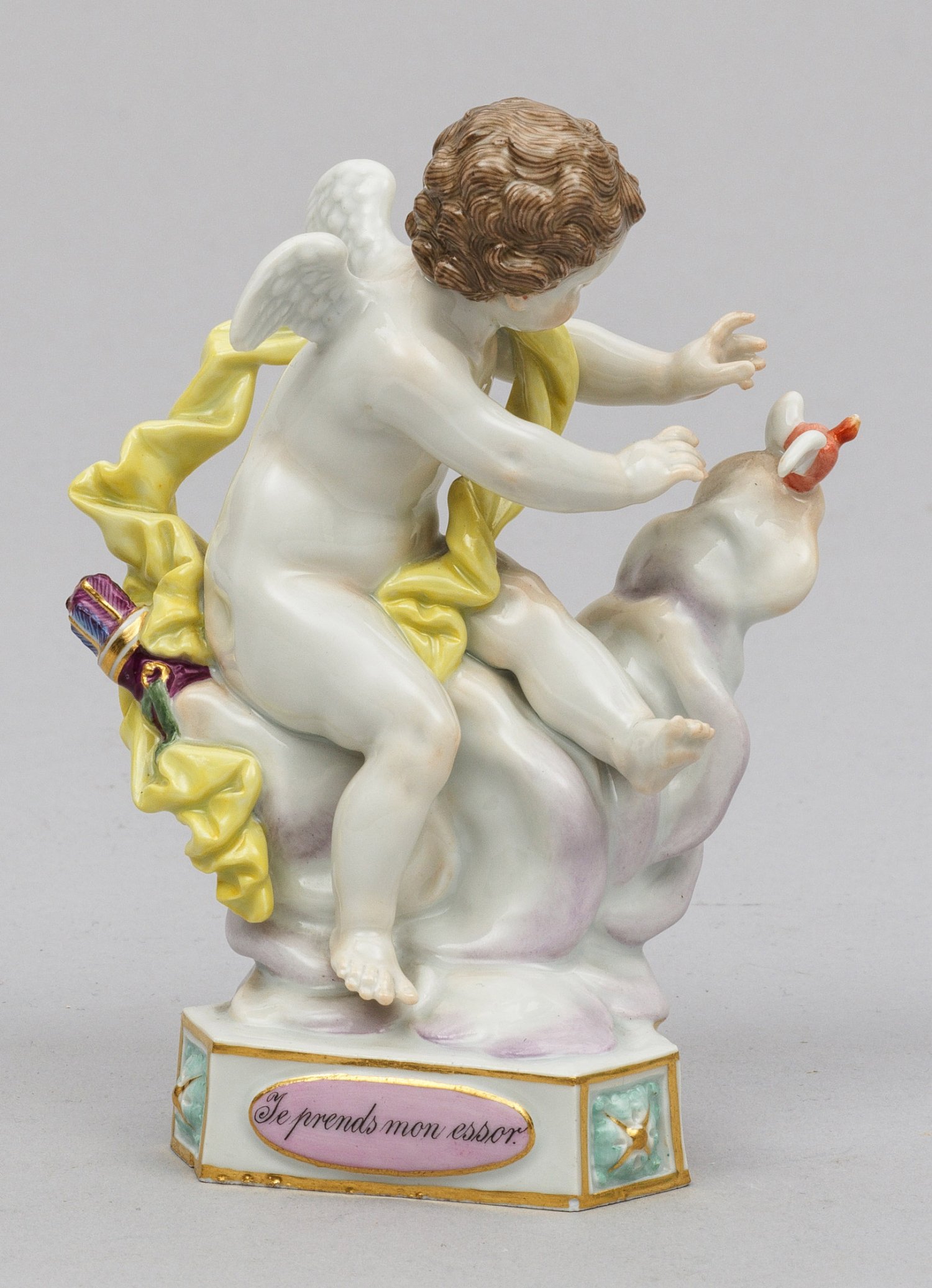 Dreiseitiger Sockel mit Rosetten, bez. "Je prends mon essor". Auf einer Wolke schwebende Amorette, nach einem flammenden Herz greifend. Polychrome Malerei mit Goldkonturierung. Entw. Michel Victor Acier. Modell-Nr. F 11. Minim. best.; Schwertermarke sowie Jubiläumsmarke. H. 13,5 cm.