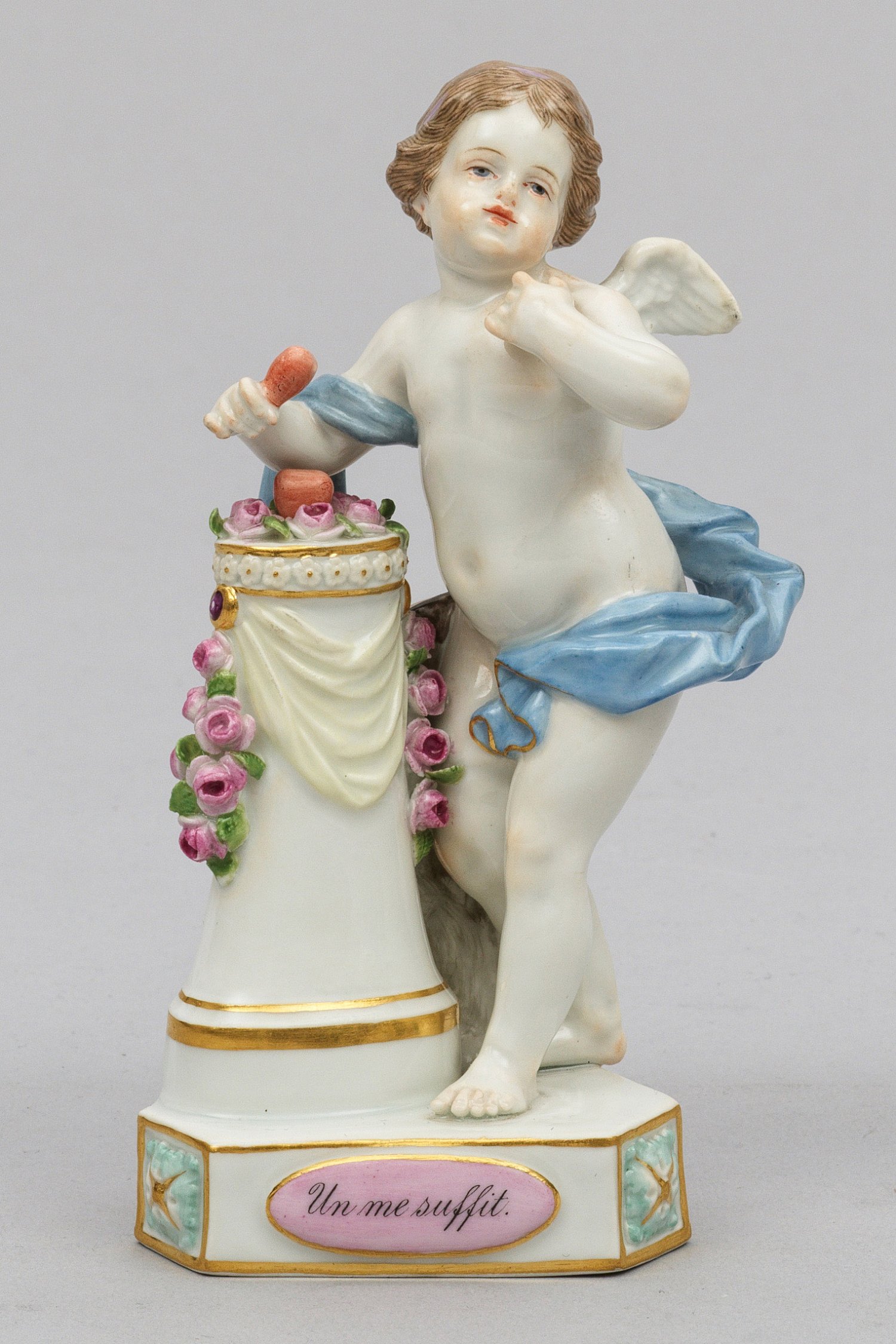 Dreiseitiger Sockel mit Rosetten, bez. "Un me suffit". An einer mit plastischen Blüten belegten Säule stehende Amorette, in der rechten Hand ein Herz haltend. Polychrome Malerei mit Goldkonturierung. Entw. Michel Victor Acier. Modell-Nr. 8. Minim. best./rest.; Schwerter- und Jubiläumsmarke 1710 - 1910. H. 14,5 cm.