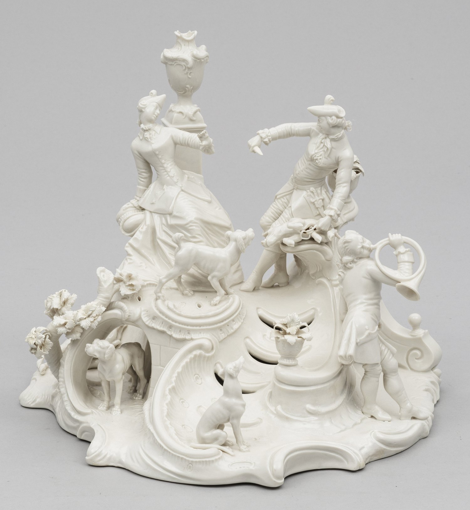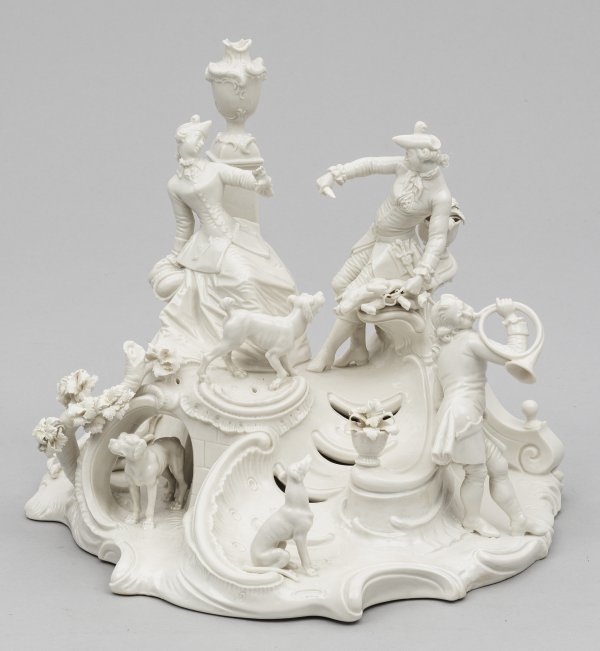 Weißporzellan. Unregelmäßig, stark rocaillefömig aufsteigender, teilw. durchbrochen gearbeiteter Sockel. Über einem Bau sitzendes, galantes Paar. Die Dame vor einer Säule mit Vasenbekrönung, der Herr mit erlegtem Wildschwein. Umlaufend des Sockels Waldhornbläser, verschiedene Jagdhunde und erlegtes Wild in parkähnlicher Umgebung. Entw. Franz Anton Bustelli. Unw. rest.; Minim. best.; Gepresste Manufakturmarke. H. 28 cm. 35 cm x 32 cm.