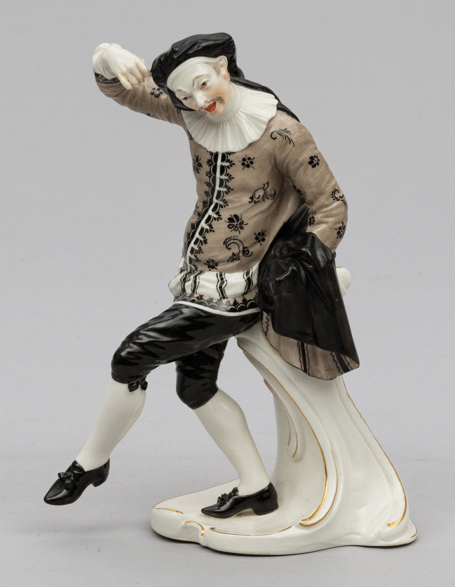 Auf Rocaillesockel, in Tanzschritt stehender Komödiant in blumig gemustertem, grauem Wams und schwarzer Hose, seinen Umhang im linken Arm haltend. Polychrome Malerei mit Goldstaffage. Entw. Franz Anton Bustelli, 1759/60. Haarriss. Manufakturmarke. H. 19,5 cm.
