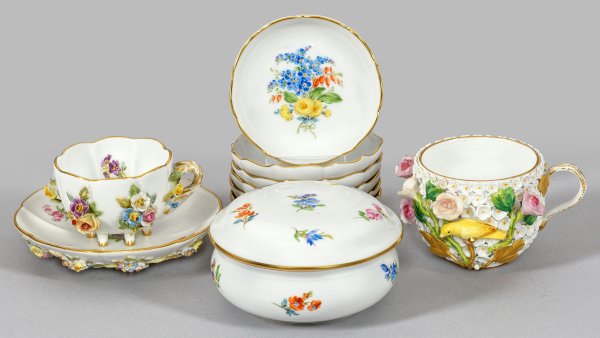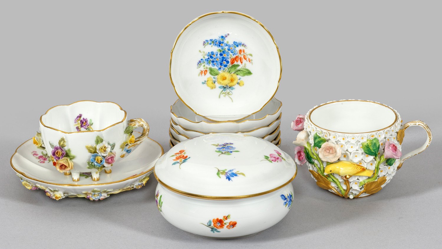 Deckeldose mit Streublümchen, 6 Nussschälchen mit Dekor "Deutsche Blume", Ziertasse mit Untertasse und reliefplastischen Blüten sowie Tasse mit Schneeballendekor aus flächendeckenden, aufbossierten, kleinen Blüten, umzogen von plastischen Blumen- und Blattranken, teilw. mit seitlich sitzenden Kanarienvögeln. Entw. Johann Joachim Kaendler. Polychrome Malerei mit Goldstaffage. Partiell best.; Minim. rest.; Schwertermarke. H. 2 cm - 5,5 cm.