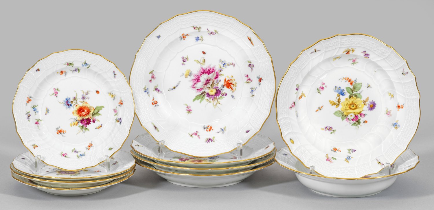 10-tlg.; 4 Speise-, 4 Kuchen- und 2 Suppenteller. Verschiedenartig vertiefte Form mit Reliefdekor "Neubrandenstein". Auf der Wandung und im Spiegel farbenprächtiger Dekor "Deutsche Blume und Insekten" in feiner polychromer Malerei. Goldrand. Schwertermarke. D. 20 cm - 24,5 cm.
