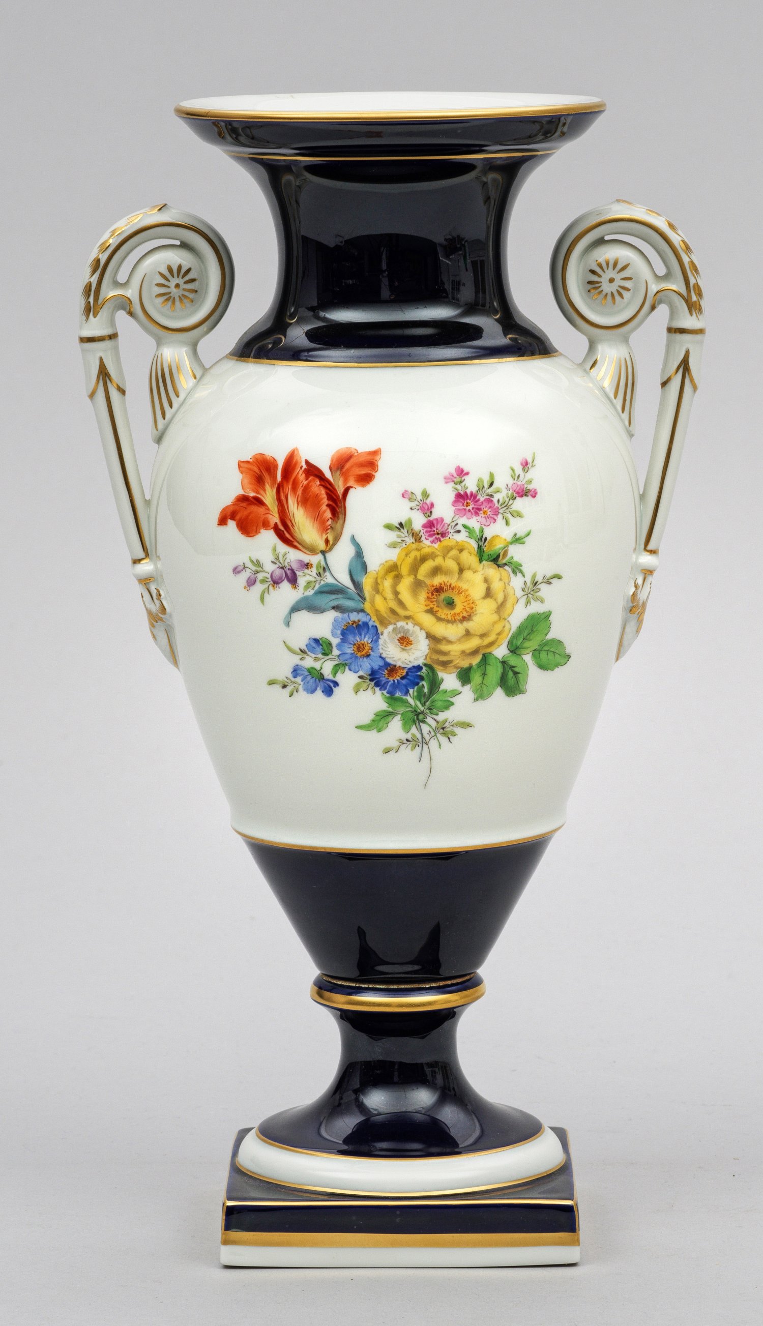 Hochgezogener Rundfuß mit Nodus auf quadratischer Plinthe. Ovoider Korpus, an gerundeter Schulter beidseitig stilisierte Rosettenhenkel. Kobaltblauer Fond an Hals und Fuß. Beidseitig der Wandung Blumengebinde. Polychrome Malerei. Goldstaffierung. Modell-Nr. 50792. Schwertermarke. H. 31 cm.