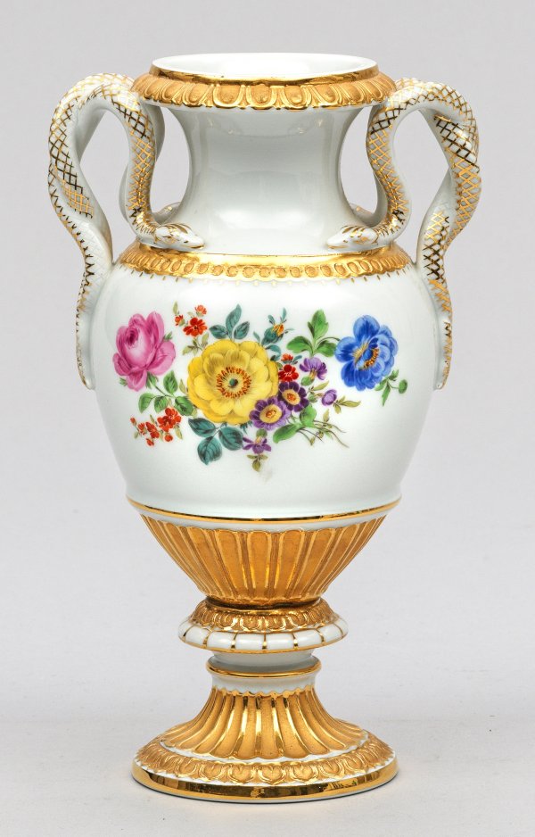 Amphorenförmiger Korpus mit reliefierten Ornamentbordüren. Seitlich aus plastischem Akanthusblattansatz aufsteigende Henkel in Gestalt von spiralförmig eingerollten Schlangenpaaren. Beidseitig der Wandung farbenfrohes Blumenbukett in polychromer Malerei. Goldstaffage mit Goldbronze. Entw. Ernst August Leuteritz. Modell-Nr. E 153 b. Schwertermarke. H. 23 cm.