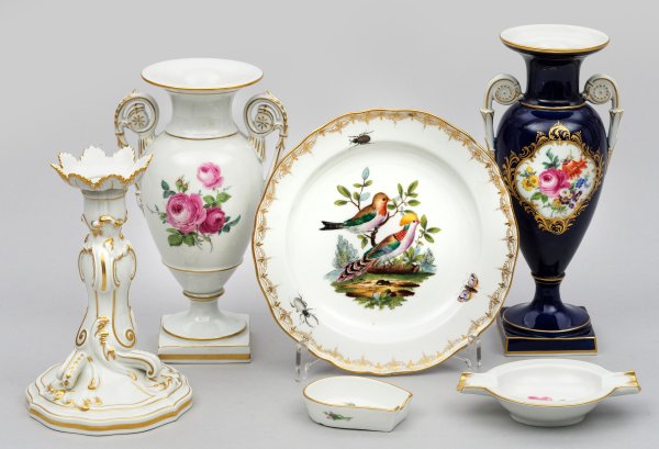 6-tlg.; Zwei Amphorenvasen, zwei Aschenbecher, Kerzenständer, Dessertteller. Tropfenfänger (rep.) als Beigabe. Teilw. kobaltblauer Fond und verschiedene Blumendekore. Polychrome Malerei mit Goldstaffage. Schwertermarke. H. 2 cm - 25,5 cm.