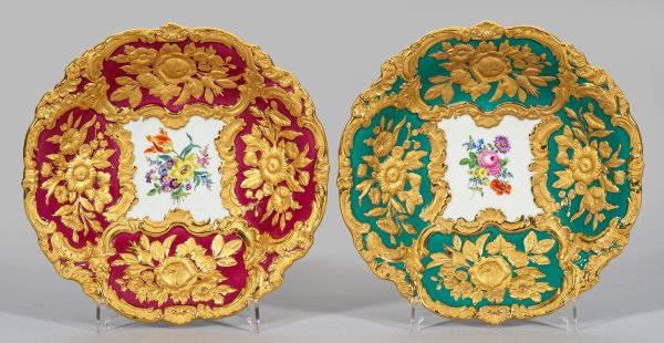 Runde, leicht vertiefte Form mit passig geschweiftem Rand. Russisch grüner bzw. purpurroter Fond mit reliefierten Rocaillereserven und Blumenbuketts in sog. Goldbronze. Im Spiegel farbiges Blumengebinde in polychromer Malerei. Entw. Ernst August Leuteritz. Modell-Nr. Z 98. Schwertermarke. D. 27,5 cm.