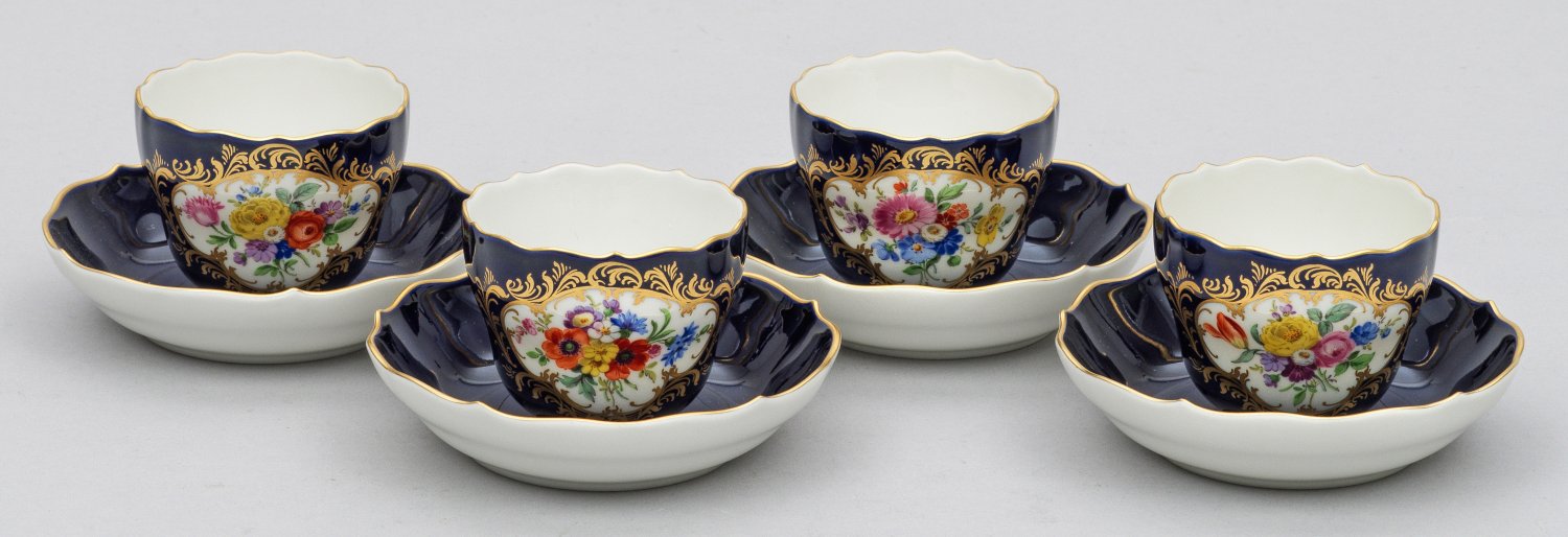 A set of four cobalt-blue porcelain mocha cups and saucers with flower decor. Crossed swords mark.