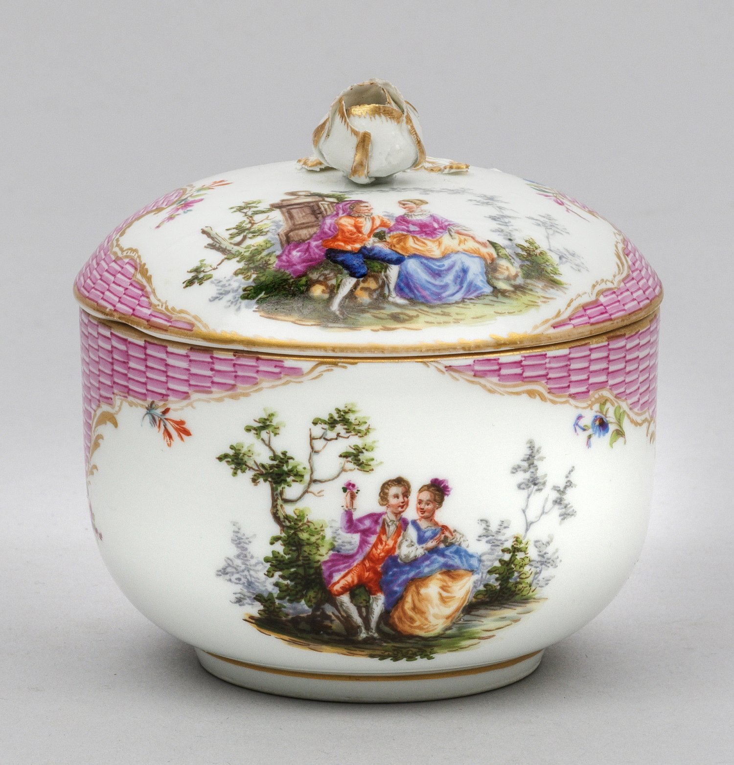 Runde Form mit gewölbtem Deckel und plastischer Rosenblüte. Beidseitig der Wandung und auf dem Deckel galante Paare in Parklandschaft nach Watteau. Breiter Schuppenmosaikfond mit Goldrocaillen und Blüten. Polychrome Malerei mit Goldstaffage. Minim best.; Rest.; Schwertermarke. H. 11 cm.