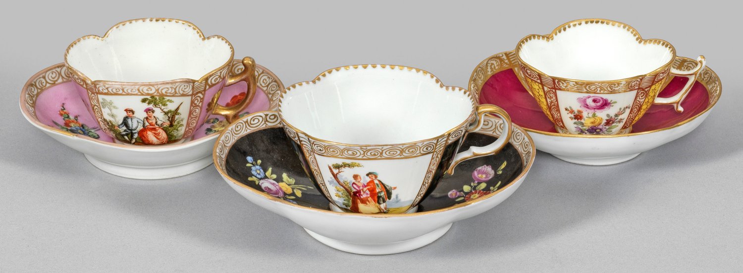 3-tlg.; Mit Untertassen. Vierpassform mit rocailliertem Henkel. In vier trapezförmigen, goldornamentierten Feldern alternierend galante Paare nach Watteau bzw. Blumenbuketts mit verschieden farbigen Fond resp. Schuppendekor. Polychrome Malerei mit Goldstaffage. Eine Untertasse farblich abweichend. Teilw. Gold ber.; Manufakturmarken. Tassen-H. 4,5 - 5,5 cm.