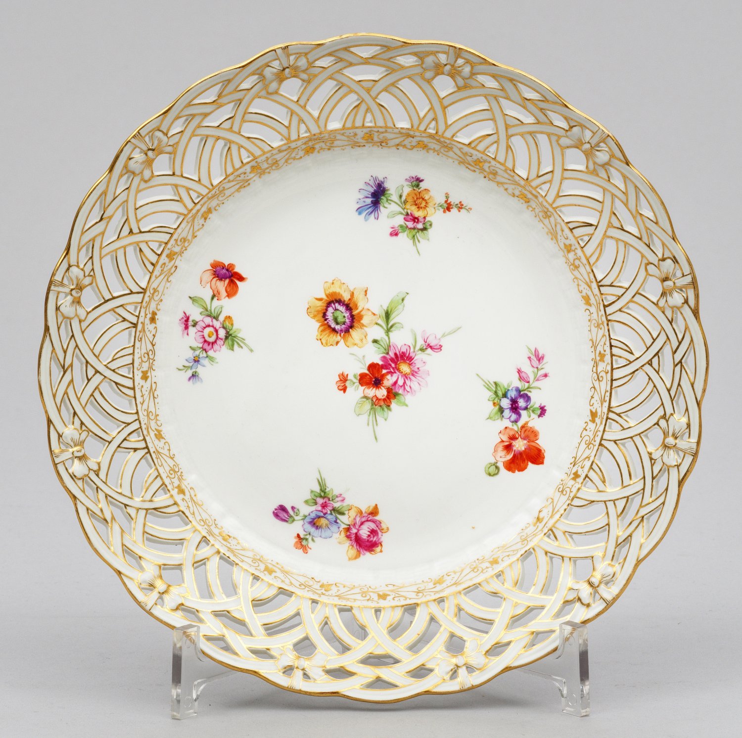 Runde leicht vertiefte Form mit passig geschweiftem, spitzbogig durchbrochen gearbeitetem Rand mit Schleifen. In der Kehlung florale Goldburdüre. Im Spiegel gestreute Blumengebinde. Polychrome Malerei mit Goldstaffage. Zepter- und Malereimarke. D. 23 cm.