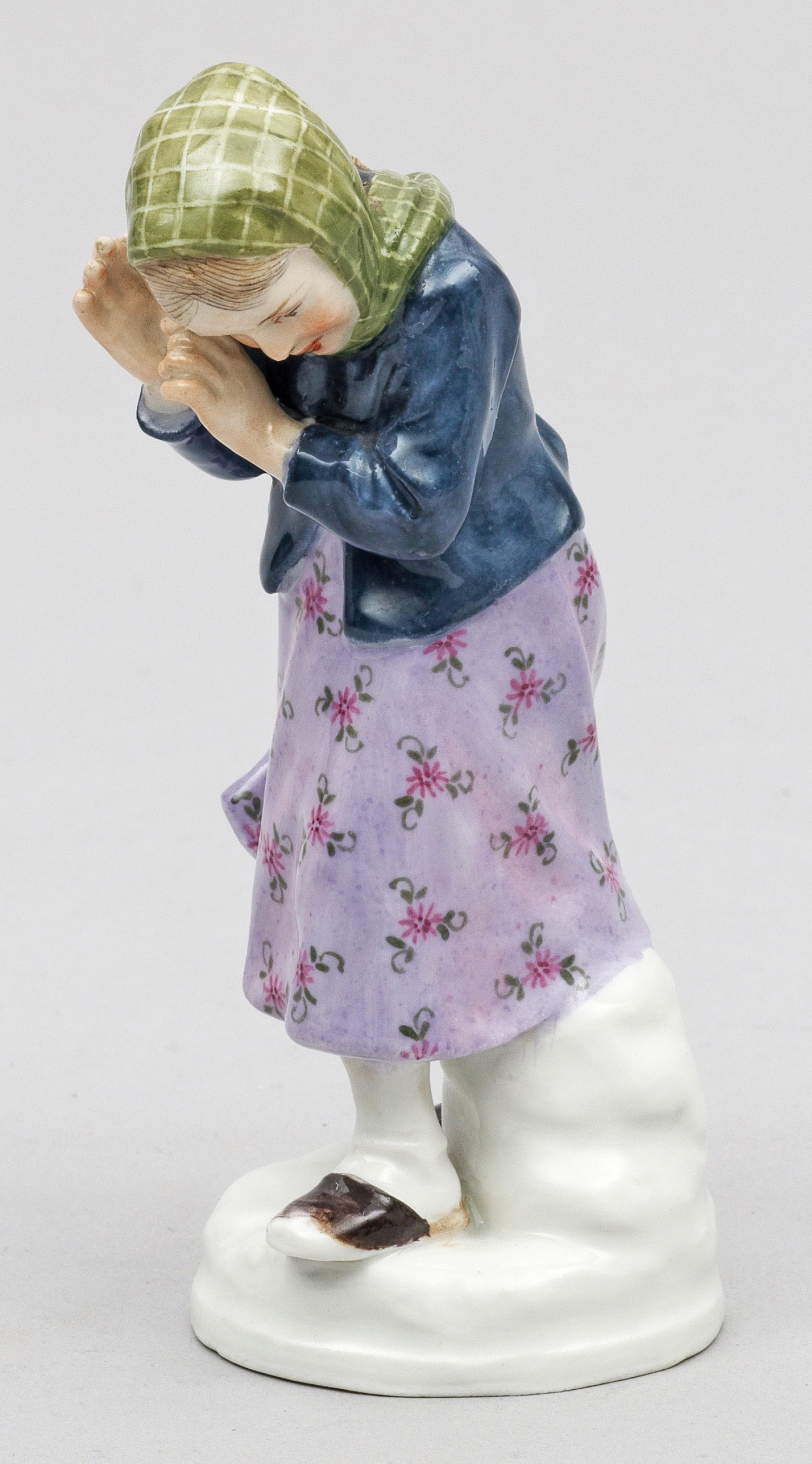 A porcelain figure of a girl in a snowball fight. Minor restored. Crossed swords mark.