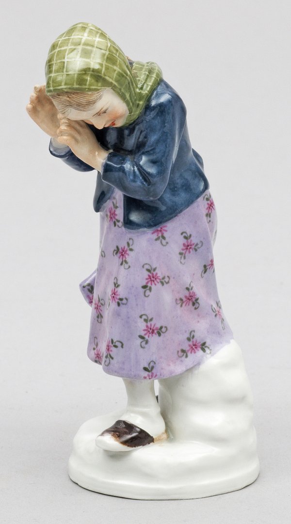 Auf rundem, schneebedecktem Sockel stehendes Mädchen, einen Schneeball abwehrend. Polychrome Malerei. Entw. Alfred König, um 1905 - 1910. Modell-Nr. W 132. Minim. rest.; Schwertermarke. H. 13 cm.