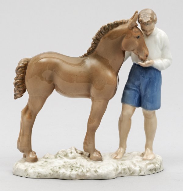 Auf Natursockel stehender junger Mann, ein Fohlen fütternd. Polychrome Unterglasurmalerei. Entw. Axel Locher. Entw.-Bez.; Modell-Nr. 2195. Rest.; Manufakturmarke. H. 20,5 cm.