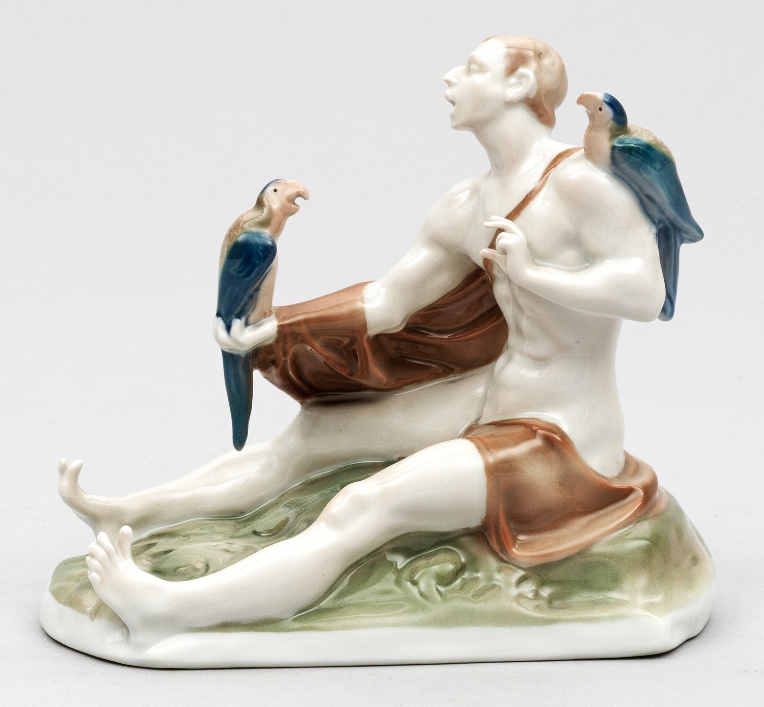 Auf einem Natursockel sitzender Halbakt in Interaktion mit einem auf dem ausgestreckten Arm sitzenden Papageien. Ein weiterer Vogel auf der Schulter sitzend. Polychrome Unterglasurmalerei. Entw. Ferdinand Liebermann, 1911. Entw.-Bez.; Manufakturmarke. H. 15 cm.