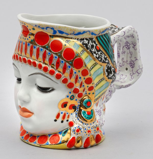 Helmförmiger Henkelbecher in Gestalt eines reliefierten Frauenkopfes mit farbenprächtigem Kopfschmuck. Polychrome Aufglasurmalerei. Entw. Natalia Danko. Minim. best.; H. 14 cm.