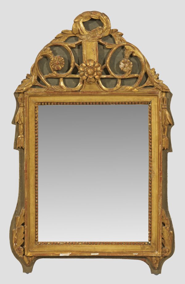 Holz, geschnitzt, olivgrün gefasst und teilw. vergoldet. Hochrechteckige, profilierte Spiegelrahmung mit Perlstab, flankiert von Blattwerk. Geschweift ansteigender oberer Abschluss aus erhaben reliefierten, eingerollten Voluten und Blütenrosette. 75 cm x 48 cm.