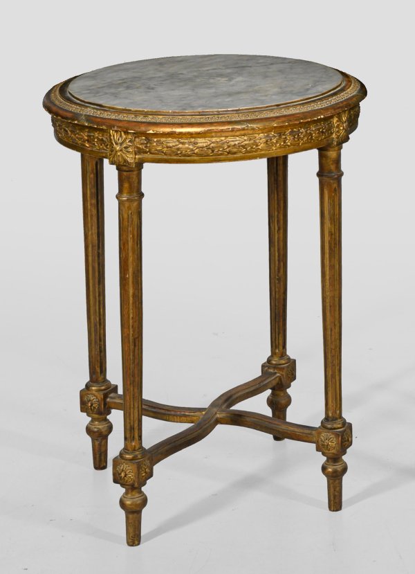 Holz, gefasst und vergoldet. Bombierte Zarge mit umlaufendem Lorbeerfries auf schlanken, kannelierten Beinen, unterhalb durch geschweifte Stege verbunden. Gering überstehende, profilgerahmte Deckplatte aus weißem, hellgrau gemasertem Marmor. H. 73 cm. D. 55 cm.
