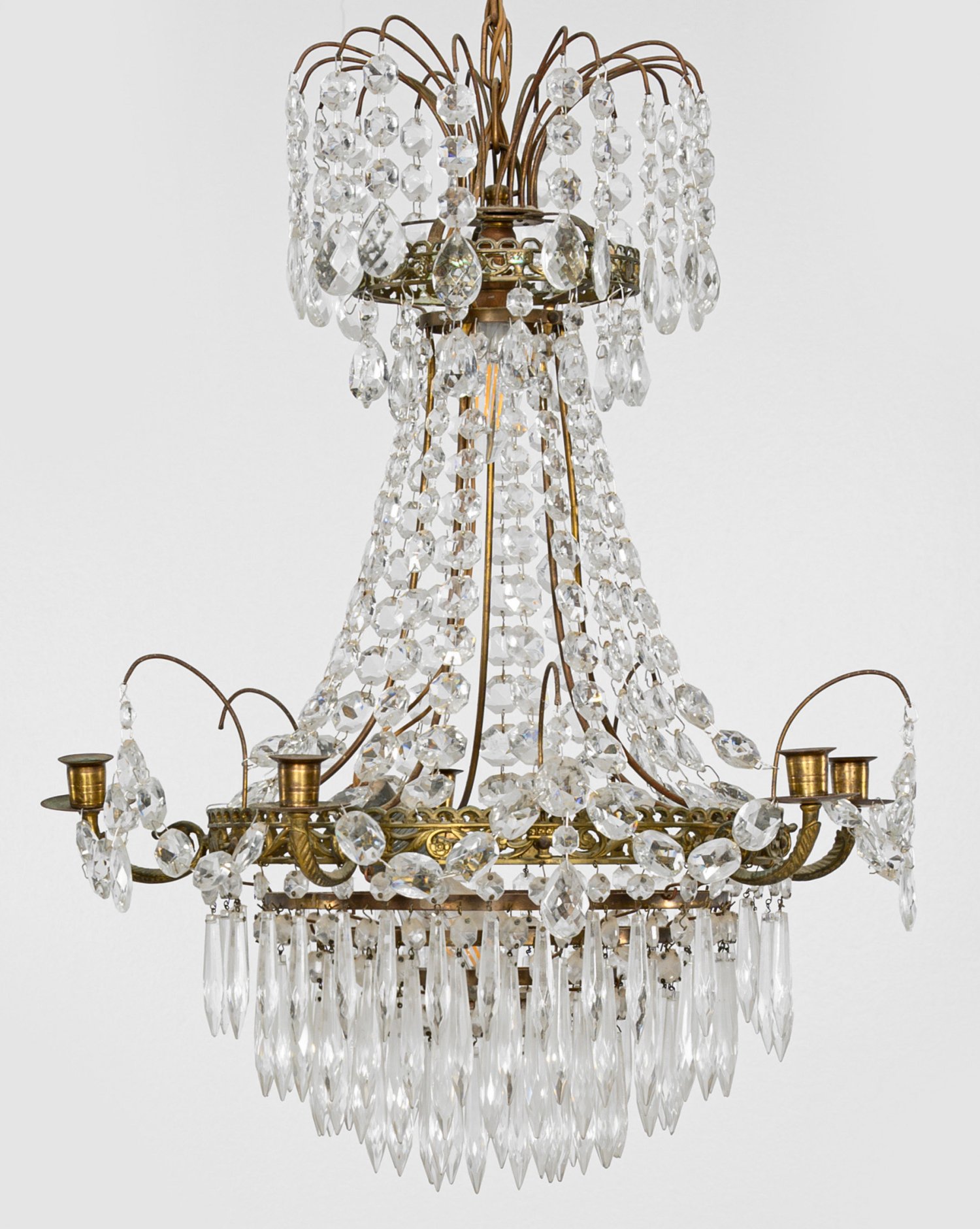 A small Swedish brass and glass chandelier. Missing parts.