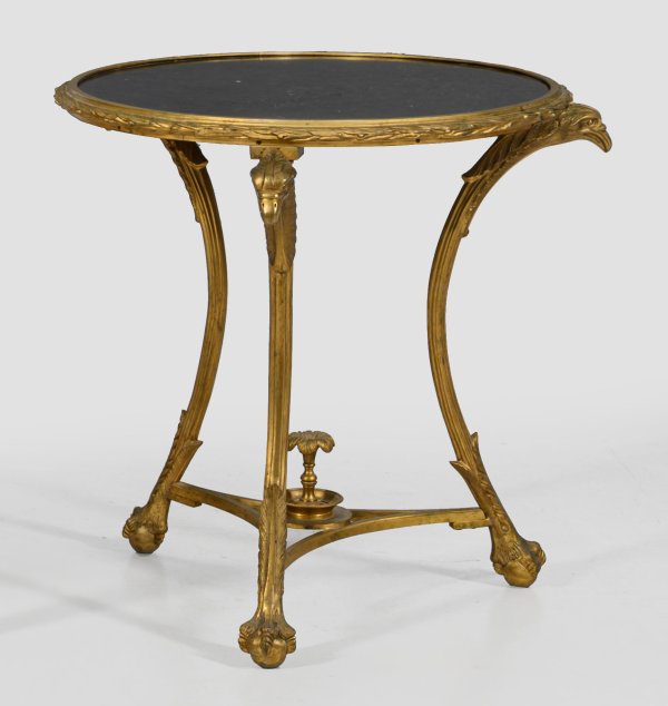 Bronze und schwarzer Marmor. Stark geschwungene Streben mit plastischen Adlerköpfen und Klauenfüßen, durch schmale, gebogte Stege mit Vasenbekrönung verbunden. Runde Deckplatte mit umlaufendem Profil aus Lorbeerblatt. H. 54 cm. D. 52 cm.
