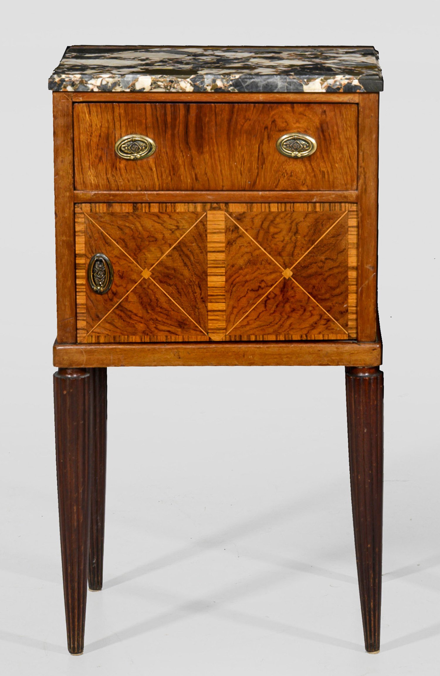 Palisander, furniert. Gerader, rechteckiger Korpus auf godronierten, konischen Beinen. In der gegliederten Front Schubfach sowie flache Tür mit gitteratigen Einlagen. Gering überstehende, profilierte Deckplatte aus grau-weiß gemasertem Marmor. H. 75 cm. 41 cm x 28 cm.