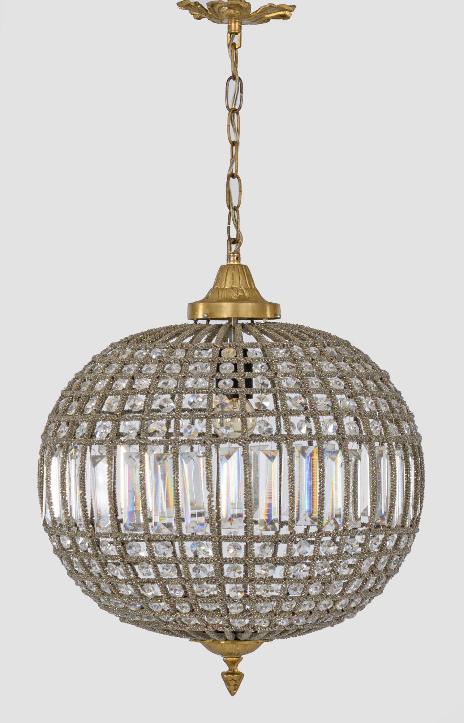 1-flg.; Metall und farbloses Glas. Kugelförmiger Korpus aus schmalen, umwickelten Streben und facettierten Prismen. Innen eine Lampenfassung, elektrifiziert. Kurze Kettenaufhängung. Ges-H. 70 cm. D. 36 cm.